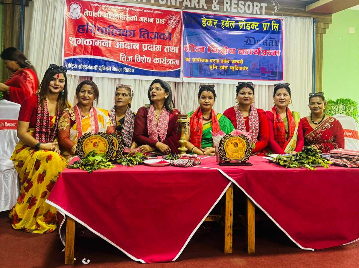 चितवन , साउन २३- राष्ट्रिय सौन्दर्यकर्मी युनियन नेपाल, भरतपुर महानगर कमिटिले महिलाहरुको महान चार्ड हरितालिका तिज विशेष शुभकामना आदानप्रदान कार्यक्रम सम्पन्न गरेको छ । युनियनमा आबद्द भरतपुर महानगर भित्र ब्यबसाय संचालन गर्ने सदस्यहरु सदभाव कायम गर्ने र शुभकामना आदान प्रर्दान गर्ने उदेश्यले कार्यक्रम गरेको हो ।